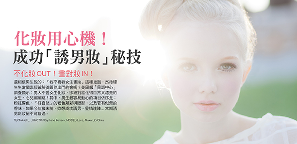 還相信男生說的:「我不喜歡女生畫妝」這種鬼話,然後硬生生當個素顏黃臉婆跟他出門約會嗎?美周報「民調中心」調查顯示:男人不愛女生化妝,卻總對妝化得自然又漂亮的女生,心兒蹦蹦跳!其中,男生最容易動心的項目依序是:粉紅唇色、「好自然」的粉色頰彩與眼影,以及若有似無的香味。如果今年歲末前,妳想成功誘男、愛情達陣...本期誘男彩妝絕不可錯過。