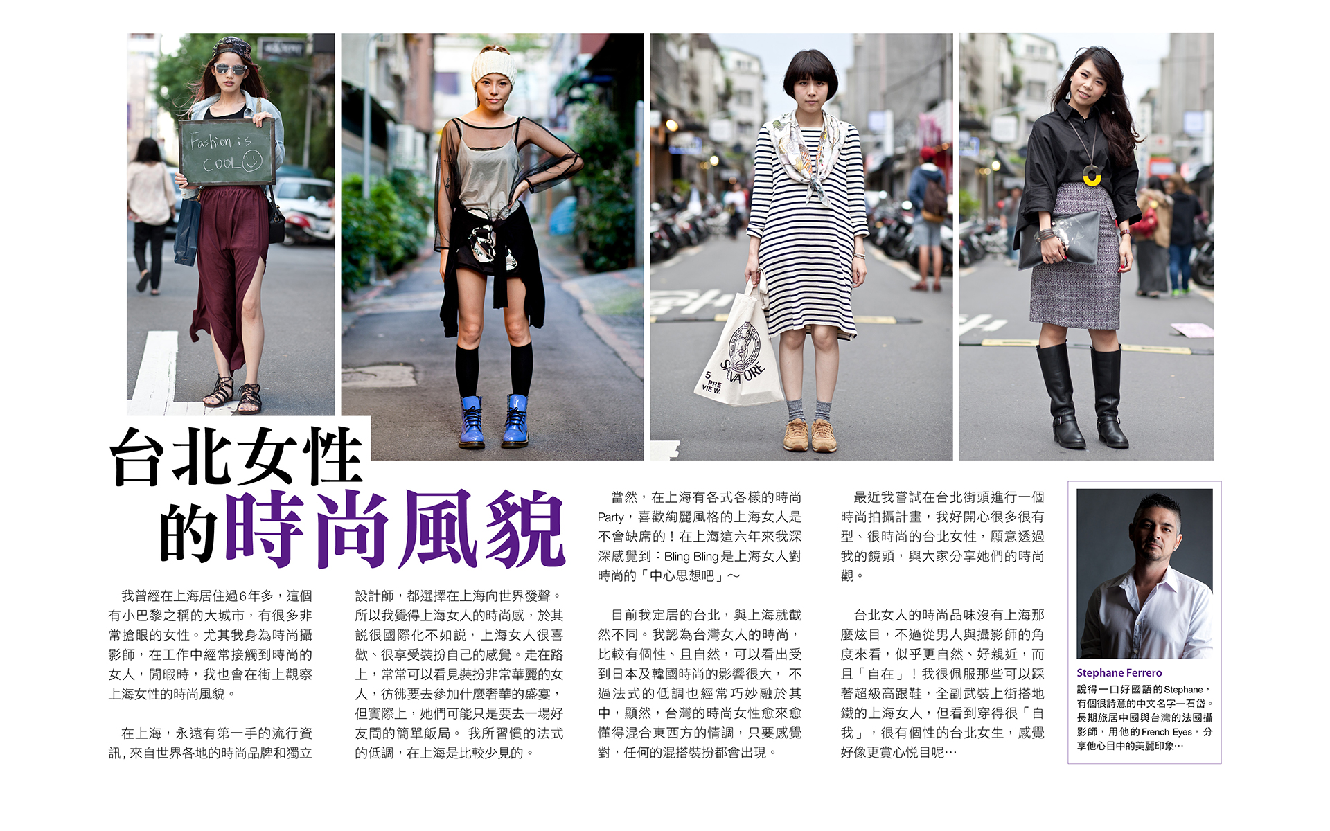 目前我定居的台北,與上海就截然不同。我認為台灣女人的時尚,比較有個性、且自然,可以看出受到日本及韓國時尚的影響很大,不過法式的低調也經常巧妙融於其中,顯然,台灣的時尚女性愈來愈懂得混合東西方的情調,只要感覺對,任何的混搭裝扮都會出現。最近我嘗試在台北街頭進行一個時尚拍攝計畫,我好開心很多很有型、很時尚的台北女性,願意透過我的鏡頭,與大家分享她們的時尚觀。
