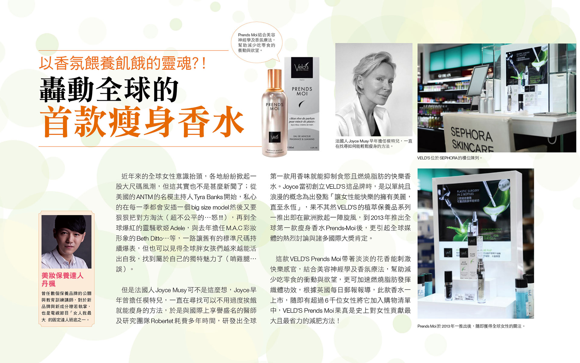 但是法國人Joyce Musy可不是這麼想,Joyce早年曾擔任模特兒,一直在尋找可以不用過度挨餓就能瘦身的方法,於是與國際上享譽盛名的醫師及研究團隊Robertet耗費多年時間,研發出全球第一款用香味就能抑制食慾且燃燒脂肪的快樂香水。Joyce當初創立VELD'S這品牌時,是以單純且浪漫的概念為出發點「讓女性能快樂的擁有美麗,直至永恆」,果不其然VELD'S的植萃保養品系列一推出即在歐洲掀起一陣旋風,到2013年推出全球第一款瘦身香水Prends-Moi後,更引起全球媒體的熱烈討論與諸多國際大獎肯定。