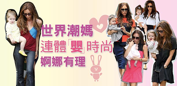 瘦得像人乾的英國女星維多利亞貝克漢,不僅是3個孩子的媽,還兼任自己服裝品牌總監,每次都穿著恨天高與貼身洋裝一手抱著孩子,貝嫂的連體嬰時尚告訴我們:「每個人都是個體,媽媽的服裝打扮決不輸孩子,各自有不同風格。」貝嫂的連體嬰時尚多以深色、貼身衣服為主,身高約160公分左右,但喜歡嘗試上短下長的服裝,意外拉長比例,即便帶著孩子,不輸媒體焦點。