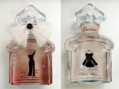「小黑裙淡香精 高級訂製晚禮服_帝王蜂印瓶限量版」,瓶身上裝飾了滿滿的蜜蜂群,製作了一個以小黑裙香氛為名的標籤,嬌蘭的女香水工藝師並且使用淡粉紅絲線完成手工蜜蠟封瓶。