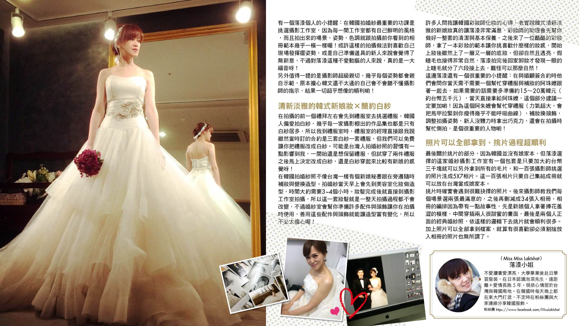 有一個落漆個人的小提醒:在韓國拍婚紗最重要的功課是挑選攝影工作室,因為每一間工作室都有自己鮮明的風格,而且拍出來的場景,姿勢,色調就跟拍攝前你看到的相冊範本幾乎一模一樣喔!或許這樣的拍攝做法對喜歡自己現場發揮擺姿勢,或是自己準備道具的新人來說會覺得了無新意,不過對落漆這種不愛動腦的人來說,真的是一大福音呀!另外值得一提的是攝影師超級親切,幾乎每個姿勢都會親自示範,原本擔心韓文還不太通的自己會不會聽不懂攝影師的指示,結果一切超乎想像的順利喲!