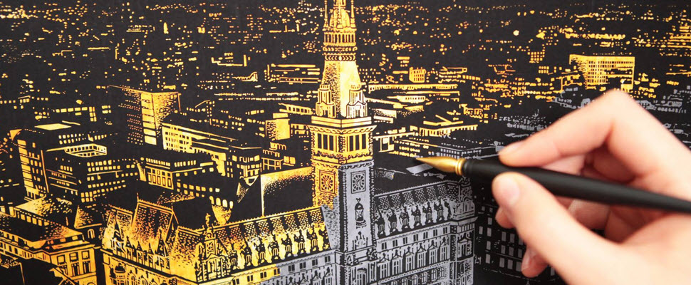 隨書會附贈金色刮棒,只要慢慢地將銀色的鋁粉刮掉,就可以看見夜晚城市燈火通明的景象,是不是很壯觀啊?!當把鋁粉都刮完後,就可以將一幅幅夜景圖掛在牆上,就成了最美的裝飾品。