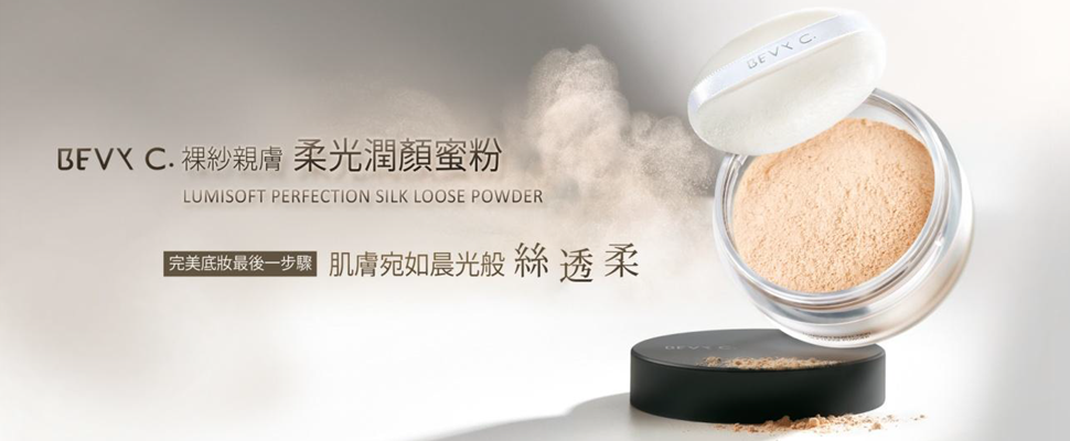 延續底妝保養新概念,BEVY C.深悉亞洲女性肌膚與底妝需求,於2015年秋天推出全新【裸紗親膚 柔光潤顏蜜粉】,融合了多重保濕因子-絲膠蛋白、玻尿酸鈉、山茶花油,賦予潤澤、柔軟、絲滑般感受,又兼具隔離環境中的有害物質,讓肌膚潤澤加倍!並以多孔球形扁平粉體結合不同效果的多種粉質,極致細膩的粉末能夠完全融入肌底,填補凹凸不平的紋理,打造出均勻光滑的膚觸;搭配Nylon-12能包覆肌膚表面多餘皮脂,消去臉上油光、提升持妝度,只要薄薄的蓋上一層,就能創造無暇的柔焦光透效果。