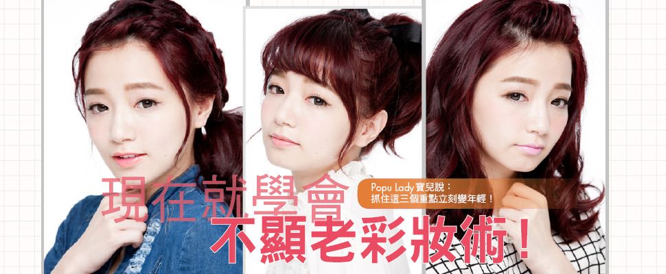 想要跟寶兒一樣甜美年輕嗎?!「透明膚色」、「粗平眉」、「下垂眼線」,這三個重點就是幫助妳瞬間看起來變年輕的關鍵!姐姐雖然濃妝看起來很有氣勢,其實換句話說就是艷麗,但如果是清純的乾淨臉蛋才真的會讓人有:「哇!妳怎麼看起來年紀變小了~」的驚艷感!TEXT/A PHOTO/Mason Make up&Hair/Sophia&Yumi Artist/Popu Lady寶兒
