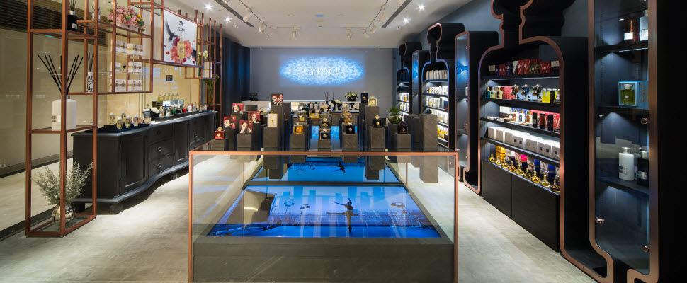 店裝潢將香水的抽象畫化作實體呈現,以木料、礦石、鈦金屬與花草編織成,而這些就是組成香氛的天然素材,讓消費者可以用感官體驗香水。一走入進內,有如萬花筒的投射與櫃位下懸浮式的80吋電視螢幕相呼應,由於香水是一個跨世代的代表,所以以香水瓶狀陳列架的鍍鈦合金材質代表現代,典雅的櫃子代表過去,凸顯出香氛精品級的風格。
