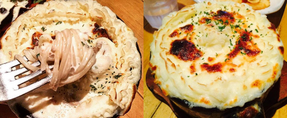 大家有沒有看到店家的誠意啊?招牌餐焗烤奶油義大利麵上頭除了滿滿的馬鈴薯泥外,就讓人流口水的就是起司,整個都滿到鍋子外面來了!裏頭的義大利麵條則是被濃郁的白醬給包覆,將麵捲起時起司也會牽絲喔,這樣一鍋焗烤奶油義大利麵是11500韓圜。