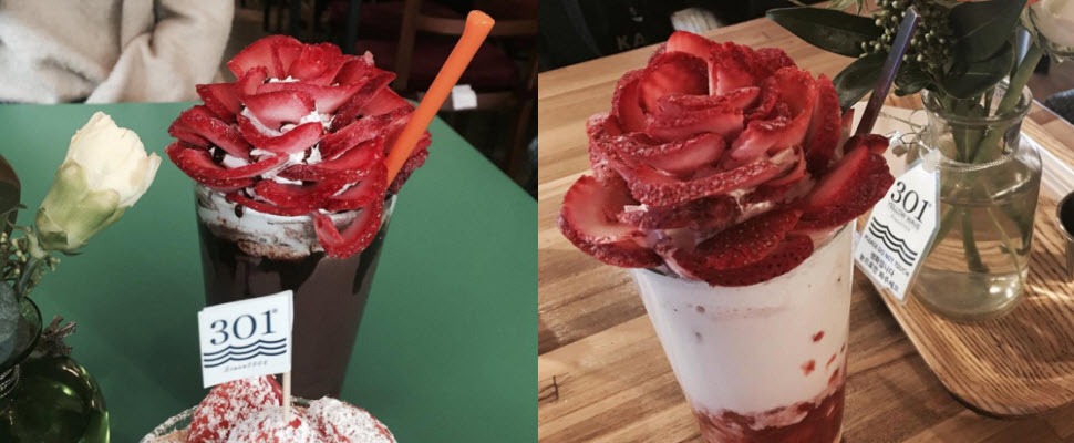 還記得小編之前介紹過的玫瑰花冰淇淋嗎?現在小編要來介紹一朵由新鮮草莓製成的玫瑰花!女孩們是不是很期待啊?畢竟應該沒有女孩不喜歡草莓酸酸甜甜的滋味吧?!來自釜山的CAFE301甜點咖啡廳有一個特色,就是各式各樣的飲品與甜點都有著超級可愛的外表,而且這家店也有不同路線的分店,像是以外帶甜點為主的 3O1 EXPRESS、以質感精緻為主的 3O1 MODERNTABLE 以及以水果奶昔為主的SMOOTHIE ELEPHANT等四家店。