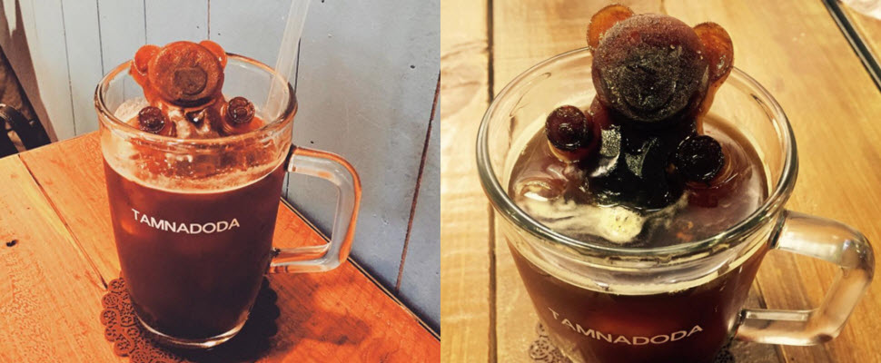 韓國的Tamnadoda就把腦筋動到冰塊上,研發出超萌的熊熊咖啡冰塊,只要你點一杯冰美式咖啡就可以看見一隻熊熊愜意的躺在杯中,這樣一杯咖啡售價為3500韓元,大約新台幣98元,價位雖然有點偏高,但是偶爾讓咖啡熊療癒一下也不過分啦~