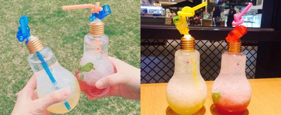 這家點位於首爾京畿道的百貨公司內,不要看他只是一家小小的店面,卻已經吸引不少人前來朝聖。飲料的選擇有很多,但主打販售蘇打飲料,所以你會看到大家燈泡裡都有氣泡喔!當然你可以選擇將飲料放裝在燈泡裡或一般的杯子裡,小編提醒價錢會不一樣喔~