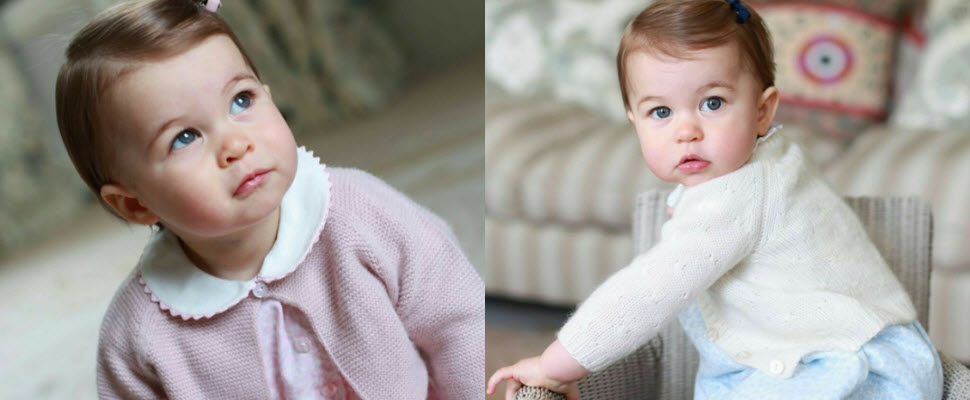 肯辛頓宮公布兩款造型四張照片,一款小公主頭上夾著粉紅色髮夾,身穿粉紅色小洋裝並搭配粉紅色毛線小外套,一張是特寫照另一張則是在草地上開心推著學步車。