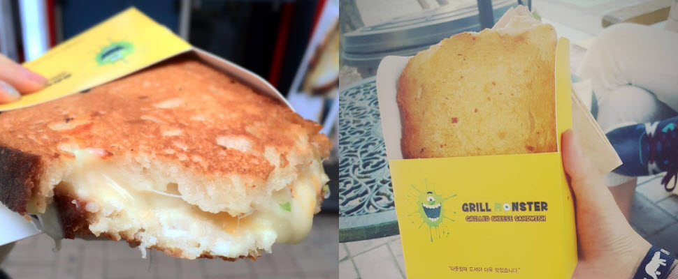 大家有發現他們家的三明治是用紙盒裝的嗎?其實不用紙袋或塑膠袋是有原因的!因為GRILL MONSTER的三明治裡面會有非常濃厚的起司,而且起司濃郁到會瘋狂牽絲的地步,不說大家還會以為你在吃PIZZA呢!看到這超誇張的牽絲照,你的內心是不是也很激動啊?大家下次到韓國一定去嘗嘗看喔~