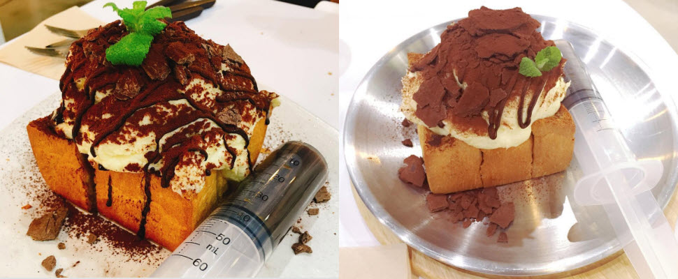 大家來到와줘서 고마워不一定會點咖啡,但一定會點店裡最具特色的提拉米蘇蜜糖吐司來嘗鮮,這樣大家應該就知道,他們家的提拉米蘇蜜糖吐司有多特別了吧?!這裡的提拉米蘇蜜糖吐司,當然不是單純的提拉米蘇口味的蜜糖吐司而已,大家有看到旁邊那支針筒嗎?沒錯,在你開吃之前要先幫這塊吐司打針!針筒裡面裝的是實實在在的espresso,在你開動前要將整隻的espresso注入提拉米蘇蜜糖吐司裡面。
