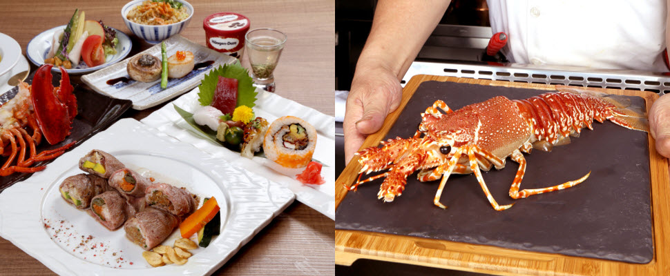 海陸鍋物雙人套餐,主菜肉片選用高檔牛排等級的熟成冷藏牛小排,客人現點、現場現切,還有海味十足的豐盛刺身盛合,還有鮮活海鮮盤寄世鍋,另外菜色亦有海鮮野菜沙拉、炙燒壽司盛合、大江戶町名物一品、日式茶碗蒸、自家製甜點。