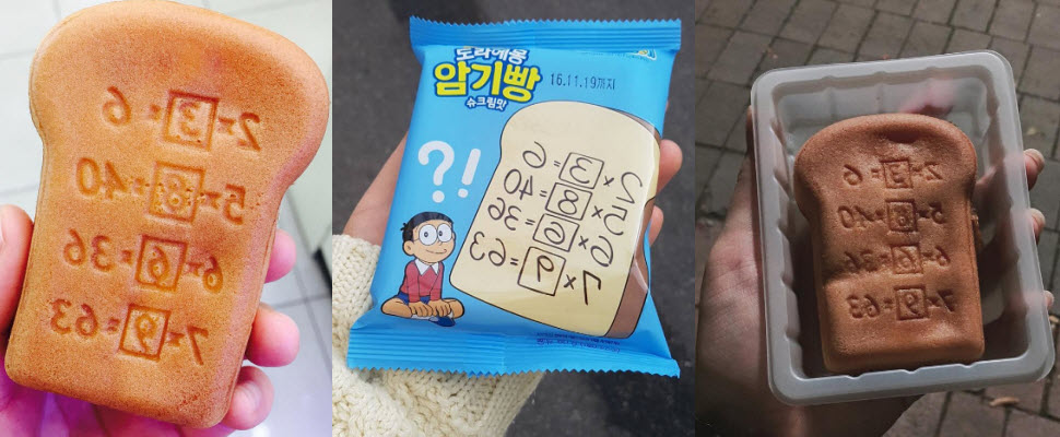 由於11/17是韓國的大學能力測驗,韓國7-11就順勢推出多拉A夢的記憶吐司,每一片吐司上面都刻有數學練習題,是不是多吃幾片數學就可以考高分呢?這對像小編這種數學白癡超級有吸引力耶~真想來一片吃吃看!最近在韓國的女孩,快點溜進便利商店嘗鮮,順便跟小編分享一下吧~