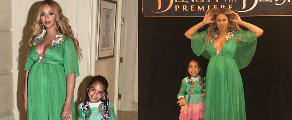 Ivy選擇跟媽媽顏色相信的綠色雪紡洋裝,飄逸的蛋糕裙搭配上黑人辮子頭,一點都不突兀反而相當可愛,大家有沒有覺得,小Ivy越來越有時尚小霸主的架式呢?碧昂絲挺著懷有龍鳳胎的大孕肚,與老公Jay Z一起現身首映會,一家五口的模樣真的好幸福喔~
