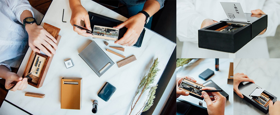 「一張名片」是一台改良型的活版印刷機,仿擬傳統活字印刷機的結構原理,改良了零件將機台縮小成兼具工具收納與精準活字印刷的木盒,體積變小、重量變輕,讓你可以隨身攜帶,還能輕鬆排出自己想要的字體與間距,隨時可以印出具有質感與溫度的名片。