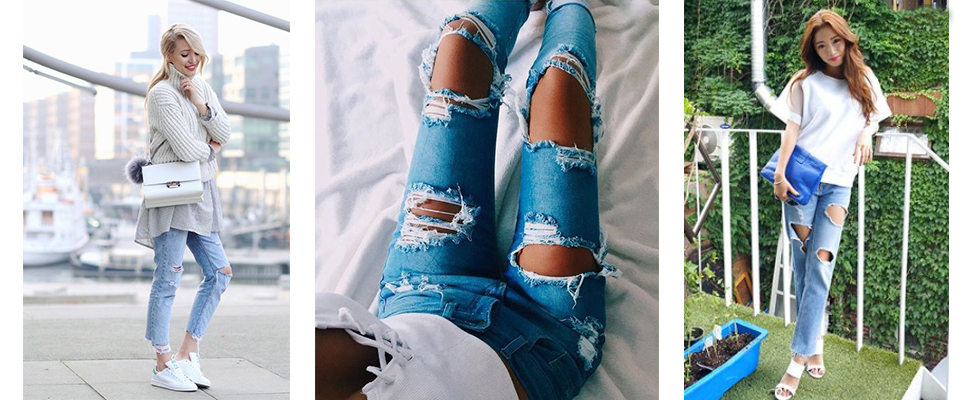好幾年前開始就會發現牛仔褲上越來越多洞,不過每年流行的破法都不一樣。這樣鬆鬆垮垮的牛仔褲另外一個名稱也是大家耳熟能詳的「男友褲」。不管破哪邊,給它破下去就對了!(不要不小心被媽媽縫補起來XD)配上球鞋、高跟鞋都非常時尚有個性。