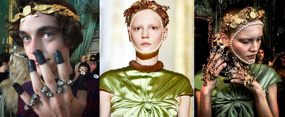 除了頭飾外,Gucci早春的戒指手環也很有戲,看看這綴滿珍珠的的指套,勾勒出手指纖長的線條,大量出現的金色品牌Logo,在Alessandro Michele的設計下,從過去老氣的形象轉變為復古華麗的新象徵。另外一個手背處炸開的繁星手環設計也別富意趣,搭配指節上滿滿的珍珠戒指,看來醒目高調的配件即將捲土而來。