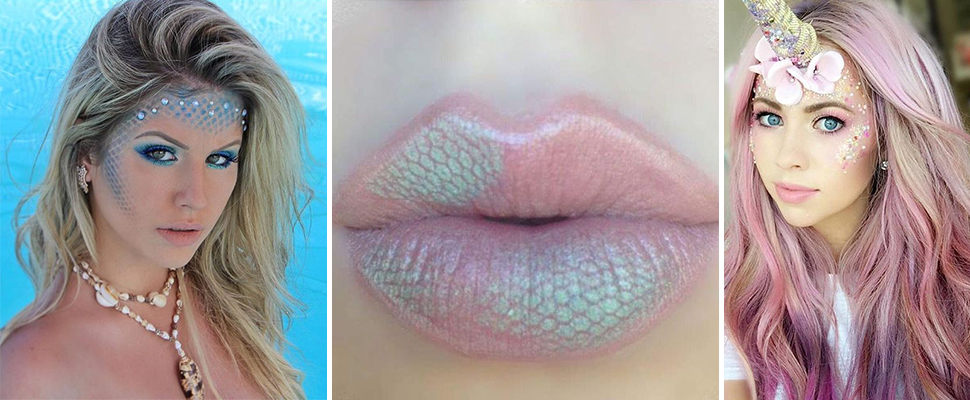如果妳的彩妝技巧高超、直逼特殊彩妝師,學學以下妝感~魅惑的藍色唇彩很符合美人魚神秘氣質,再掌握美人魚妝容重點:金粉、亮片、珍珠、海星、貝殼等海洋特徵,讓人彷彿看見真的美人魚。