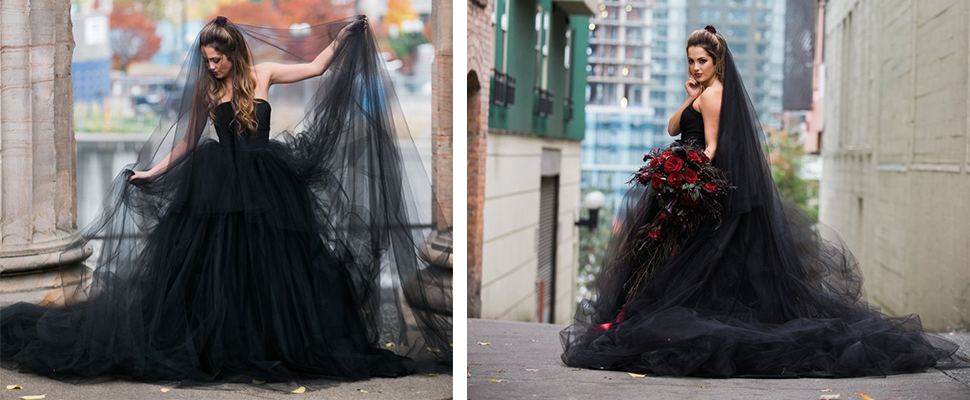 黑色婚紗以層層薄紗堆疊而成,澎澎的裙襬勾勒華麗復古的形象,輕掩在禮服外的薄紗,有著黑色迷霧般的視覺效果,搭配同款頭紗包裹住新娘,強烈的戲劇效果拍攝起來別有一番迷人的姿態。