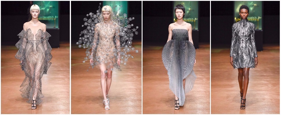 這次正是Iris van Herpen創立10周年,設計師延續她獨特的線條美,運用黑暗與光芒、空氣流動、水波粼粼等紋樣效果,像是有著冰冷距離,卻又傳達複製、複印的對稱美感,藉由模特兒行走的擺動,讓服裝的波紋與線條有了律動感,前衛而迷人。