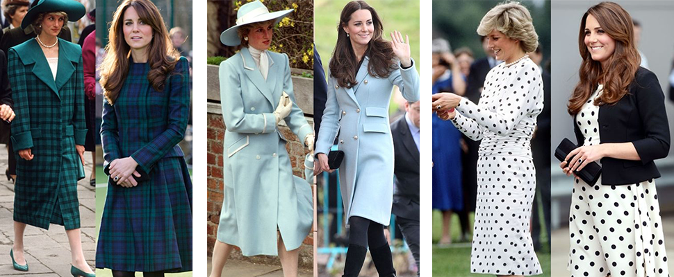 還是風衣式洋裝,這樣看下來女孩大概也掌握了黛妃的口味,她偏好下擺直筒設計的風衣外套,而凱特王妃則喜歡一點洋裝裙擺的甜美感覺。這個Look同時出現在兩位王妃下出訪時,而且手上還各抱一個搶眼的小娃,真是個可愛的巧合。