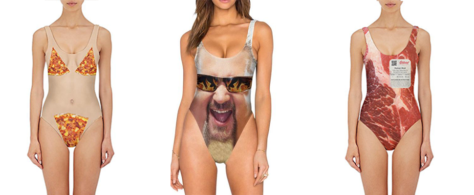 這套Pizza比基尼算是頗有創意,雖然上面的Pizza位置令人不太舒服,不過看在它不會嚇到路人的份上,女孩真的想買的話小編也不反對啦。至於這件酪梨泳衣,無厘頭指數就滿高的,尤其那鮮豔的綠,那逼真的果核,真的會讓妳引來路人的大批關注呢。想出奇制勝的成為沙灘焦點,不妨選它。
