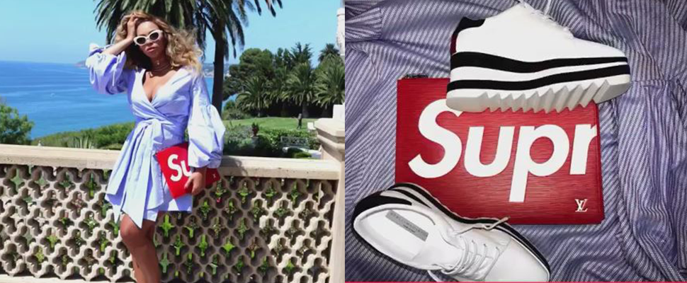 穿著Alexis低胸裹身條紋襯衫洋裝的Beyoncé,下身搭配休閒厚底鞋,秀出閃亮戒指及項鍊搭配,還有臉上那隻極襯她巨星氣勢的貓眼墨鏡,時尚又俏麗。不過讓眾多粉絲驚豔的便是她手上那個亮眼的Louis VuittonxSupreme聯名手拿包啦!原來這項夯物還能這樣搭!