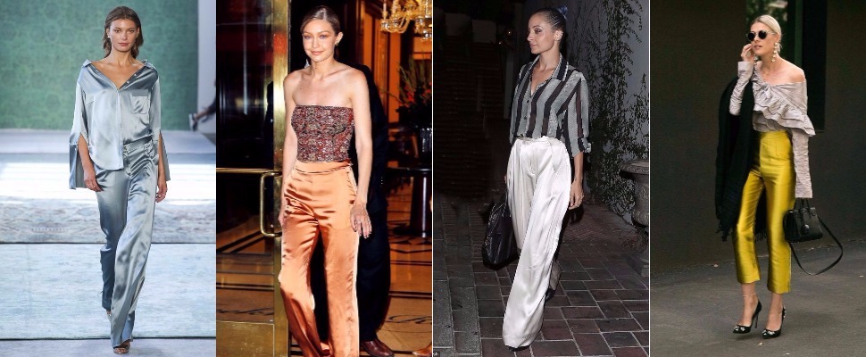 說到緞面大家第一個想起的,應該就是睡衣風吧!想必大家都有注意到今年流行的睡衣風走的都是緞面材質,而不是棉質的,因為棉質穿起來就是包租婆了(笑)。顏色和款式也沒有限制,反而越顯眼越好,畢竟穿睡衣出門這件事,已經很高調,然後一定要蹬雙細高跟,雙槓涼鞋或時尚尖頭才能洗去睡衣感,請看右圖Gigi的示範。