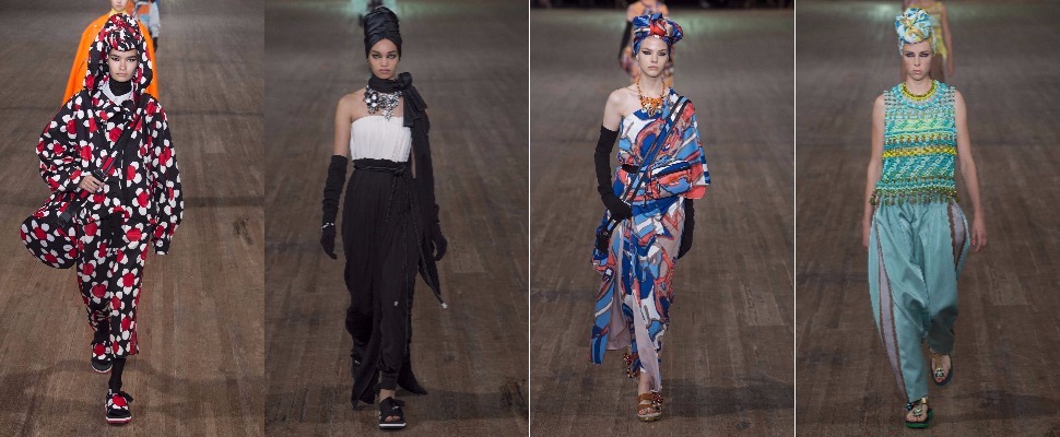 不得不說小馬哥很會創造話題,秀上為每個model「安裝」了充滿異國風情的頭巾,出自英國鬼才帽子設計師Stephen Jones之手,甚至有人戲稱是剛洗完頭就準備出門的造型(笑~也很像沙龍裡一次排開等吹整的貴婦。