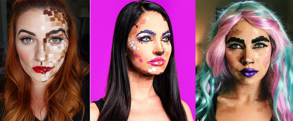 樸素的大地色系太無趣?那來挑戰一點進階的變化妝吧!這兩款妝容首先要打上厚厚一層底妝,最用妳最遮瑕的粉底液遮入所有肌膚紋理,看起來會更貼近電腦繪圖的效果。接著將眉毛、雙唇的邊線都描出一格一格的線條並填上顏色,臉部的也別忘了靠深淺色做出陰影效果,講究一點的女孩可以向潮人一樣帶上相襯的假髮,讓人大呼Amazing的進階妝就完成啦!