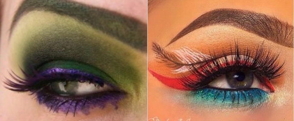 先從夢幻版的迪士尼公主開始,粉色的眼影點綴上粉色珍珠和亮片,就是夢幻的睡美人啦!而右上的紅藍色眼線加上咖啡色眼影是有印地安風情的寶加康蒂!而如果想要辦成小美人魚的話,就用綠色亮片的眼影在眼尾幫自己畫個閃閃發亮的魚尾巴吧!而右下經典的黃色和咖啡色的配色,當然就是美女與野獸裡的貝兒。