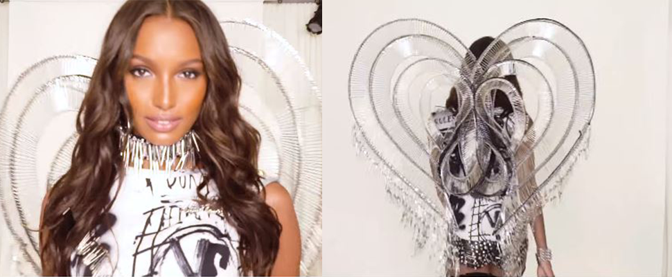 Jasmine不只搶先揭露她今年的銀色翅膀,還加碼放送一個秘密,她說:「其實天使們的翅膀都是模特兒純手工製作的,我做這個大概花了800個小時。」真假?當然只是天使的玩笑話啊(要不然以她們的工時計算,維密早就破產啦)~她一邊介紹了自己的金屬翅膀,仔細看,那上面一大串「叮叮噹噹」的設計,居然是一整排安全別針,連衣服也掛了一堆別針,下秀後還可以「資源回收」繼續使用,很有環保概念,只能大讚Olivier的鬼才本領了,不僅舞台效果十足,還表現了愛地球的時尚態度。