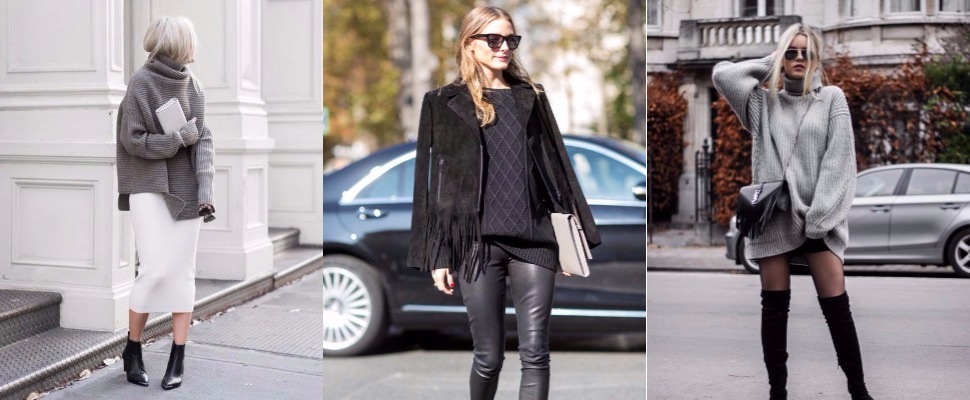 今年冬天沒有一雙過膝靴是不行的,女孩可以集中火力挑選一件寬鬆毛衣洋裝。配色像Gigi穿的全身灰就很好看,相較之下左邊的全身黑看起來則是很有個性。(中)白色格子毛衣,下搭黑靴已經夠時髦,如果想再進階,搭配造型靴,保證回頭率超高(不過像這種綁腿款,腿不夠細勿嘗試,容易變叉燒蹄~笑)。