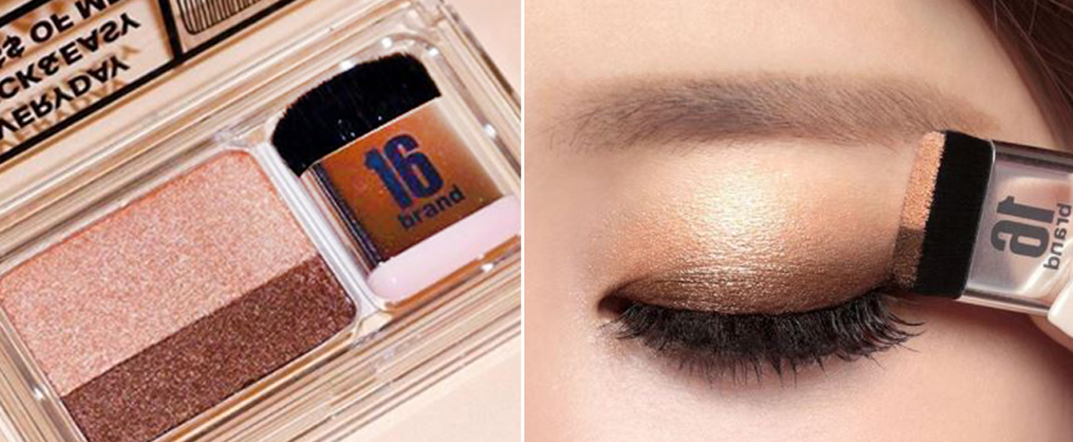 這盤眼彩看似平凡,不過知道它的使用方式之後肯定會讓你大呼「神發明」!一般女孩畫眼妝時最怕暈染不好,整個眼皮就顯得髒髒灰灰,不但沒有電眼的效果,看上去還矬矬的有夠糗。這塊的眼影盤就是為搞不定眼妝的女孩發明的電眼神器,16 Brand以扁平、寬大的眼影刷取代一般眼影棒,特殊角度的眼影刷能貼合整塊眼皮,只要平平的沾取眼影,對準眼皮刷上,就能創造自然又超美的漸層眼影!