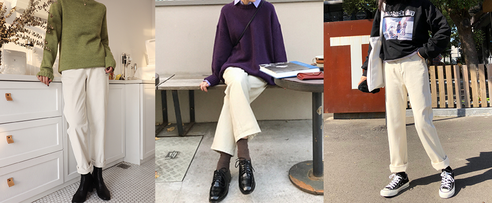 基本上小白褲和任何鞋款都百搭,想走文青一點的隨性風格,換上小白鞋或帆布鞋絕對不會錯,想抓住韓妞精隨,出動秋冬正夯的踝靴,基本款也能搭出時髦好品味。