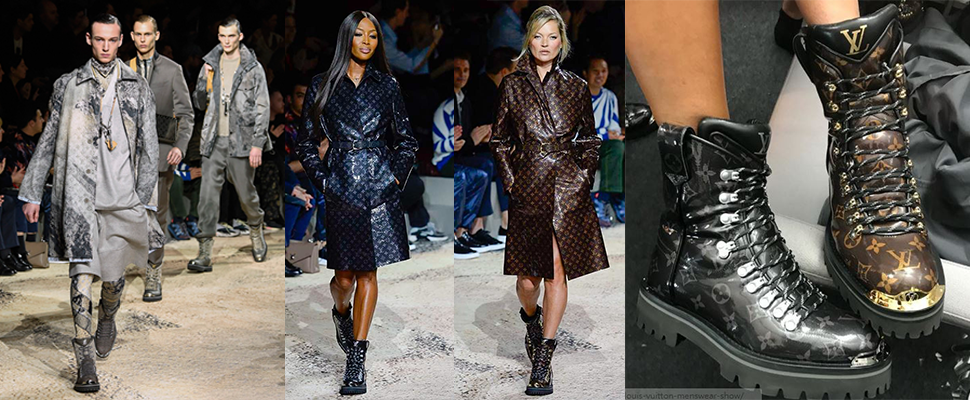 不過、最令小編眼睛一亮的就是模特兒腳上各式各樣都很帥氣的軍靴,滿版品牌經典印花搭配異材質拼接、撞色、金屬片的裝飾下,沒有半點令人皺眉的土豪感,反而連女生看到都好想下單!模特兒身上背的Infinity Dark郵差包也相當亮眼,昭告時尚迷斜背小包仍是大勢,記得出門把包包帶子調短一點。