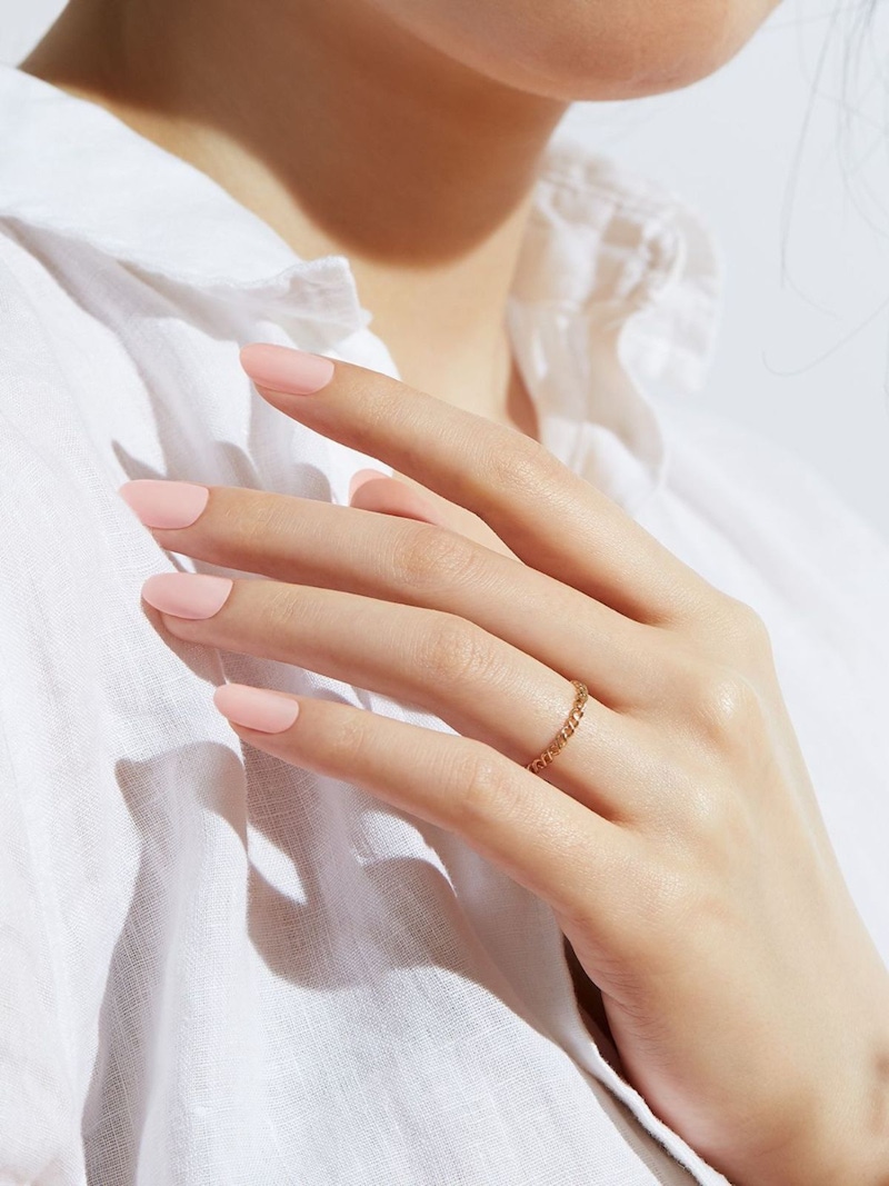 指尖往往能夠決定整體造型的細節感與完成度。不需要營造強烈的存在感,而是要將重點放在延伸、修飾手部線條的效果。建議避開高飽和的螢光色、低明度的深色系,改選果凍色、裸粉色、燕麥色等低飽和色調,讓指甲顏色與膚色之間的過渡更加自然。這類色系與春裝搭配時不會顯得突兀,整體看起來乾淨、有層次,同時又能保留低調的高質感,讓指彩自然的融入造型之中。