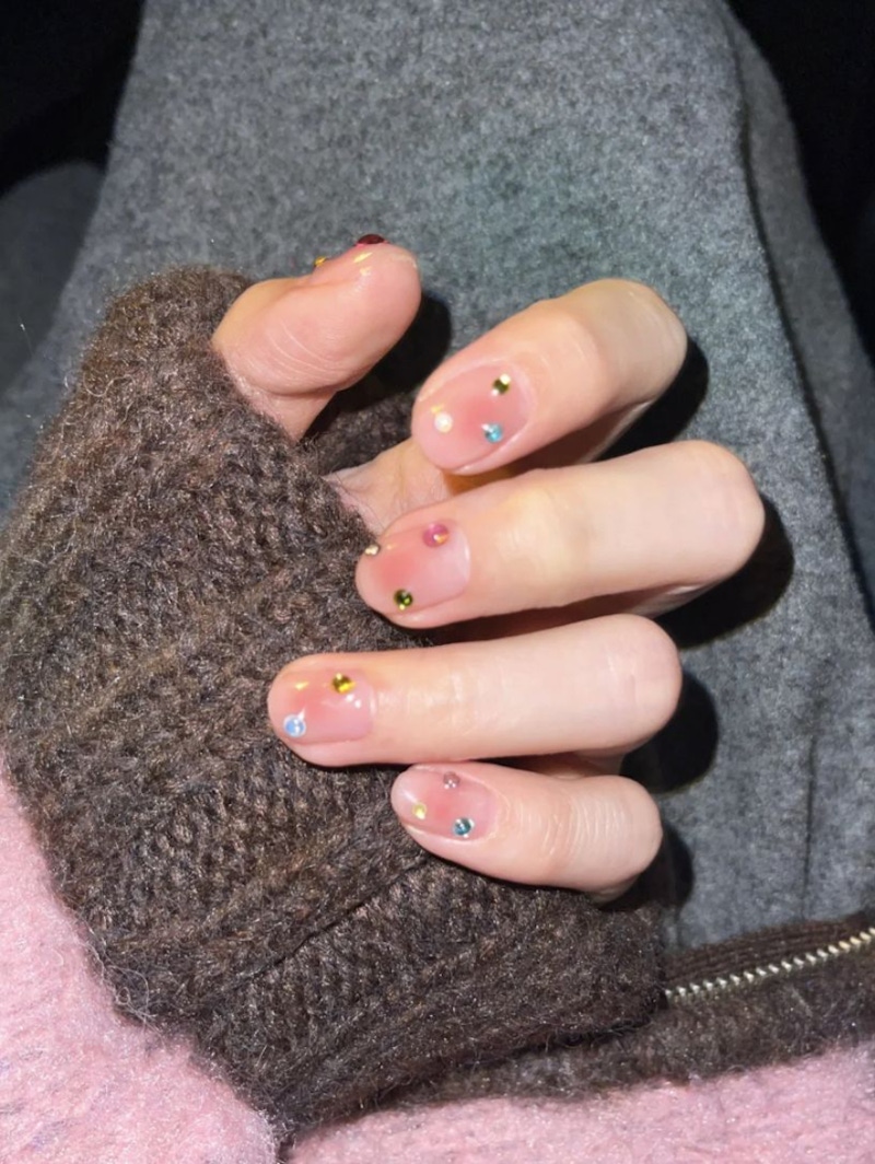 五彩繽紛的小寶石也非常適合 2026 春夏。以琥珀色、翡翠綠等彩色小寶石作為點綴,呈現出帶有 Y2K 風格的亮點設計,同時透過顏色的深淺變化與透明度增加細節感,讓手部造型變得更加精緻。搭配簡單的裸色、低飽和底色時,寶石元素會顯得更加突出,視覺上也會更有重點;在保留華麗感的同時,仍然能維持整體造型的平衡,非常適合春夏兩季。