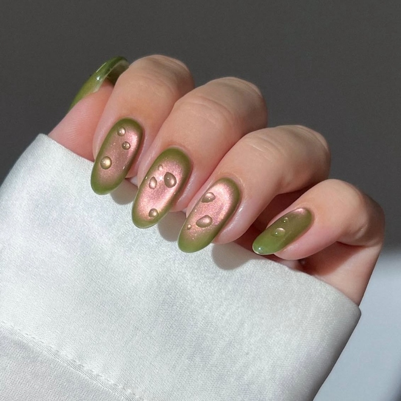 立體水滴是春季美甲中的常見元素之一,多會利用透明造型膠在甲面上點綴出飽滿、晶瑩剔透的小水珠。這樣的裝飾能為美甲增加一點立體細節,使其富有變化感;如果讓水滴呈現不規則形狀,效果還會更加自然。不管是搭配漸層、貓眼,還是腮紅美甲,都能透過不同質感的對比,讓水滴元素更加突出,也能讓簡約的美甲款式看起來更有特色,十分的俏皮、可愛。