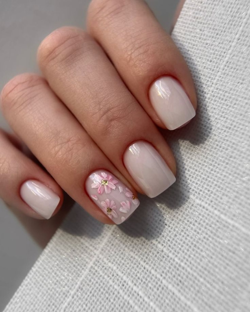 2026 春季的花卉美甲設計偏向輕透、低飽和與極簡隨性的風格。與過去較為繁複、細膩的彩繪方式相比,今年多以暈染、局部小花與手繪線條來呈現花卉元素,讓圖案看起來更清新、更自然。部分設計還會加入珍珠、細緻金屬等 3D 立體點綴,在不增加複雜度的前提下,提升指彩的細節感。這種風格通常只會在 1、2 片指甲上加入花卉元素,其餘則維持乾淨底色,讓美甲看起來更清爽,也更符合春季的輕盈氛圍。
